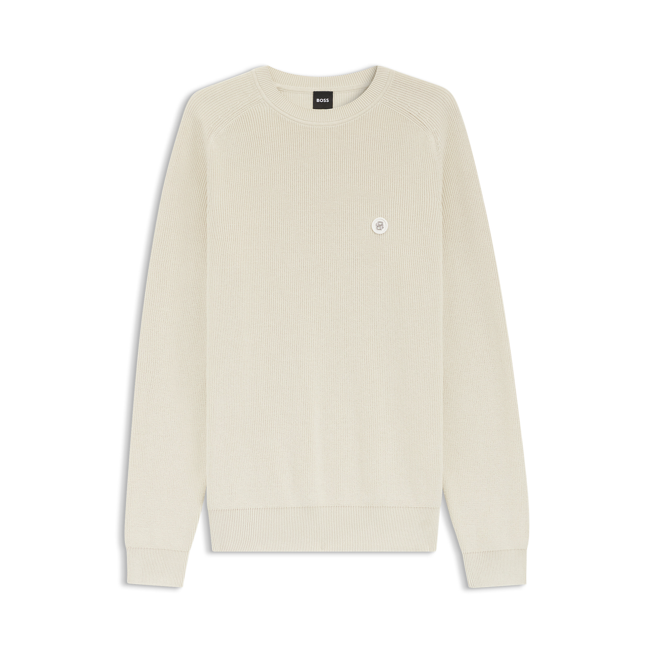 Layer up in effortless style with the soft cotton knit and Double B monogram trim of this BOSS Menswear sweater. Easy regular fit. This product contains at least 80% better raw materials.This piece is made with at least 80% cotton derived from regenerative agriculture.Regenerative agriculture prioritises the preservation and restoration of natural environments, aiming to enhancebiodiversity, maintain water quality, and improve soil health.