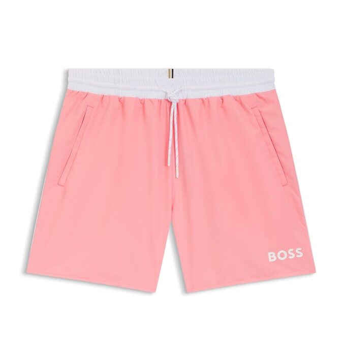 In naturally quick-drying fabric, these BOSS Menswear swim shorts have contrast branding and piping. Signature-stripe detail at the back. This product contains at least 80% better raw materials. This product is partly created with recycled polyamide.