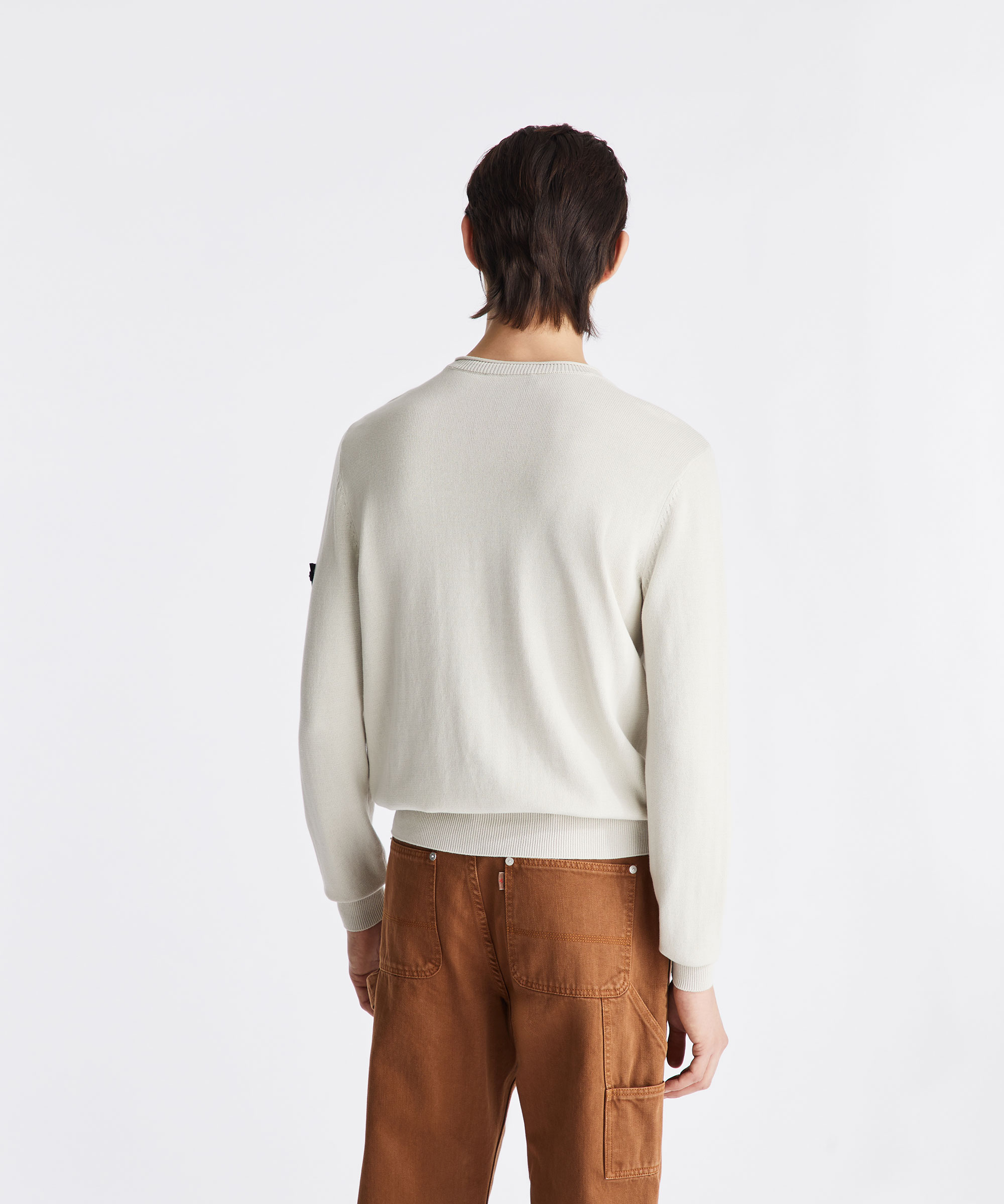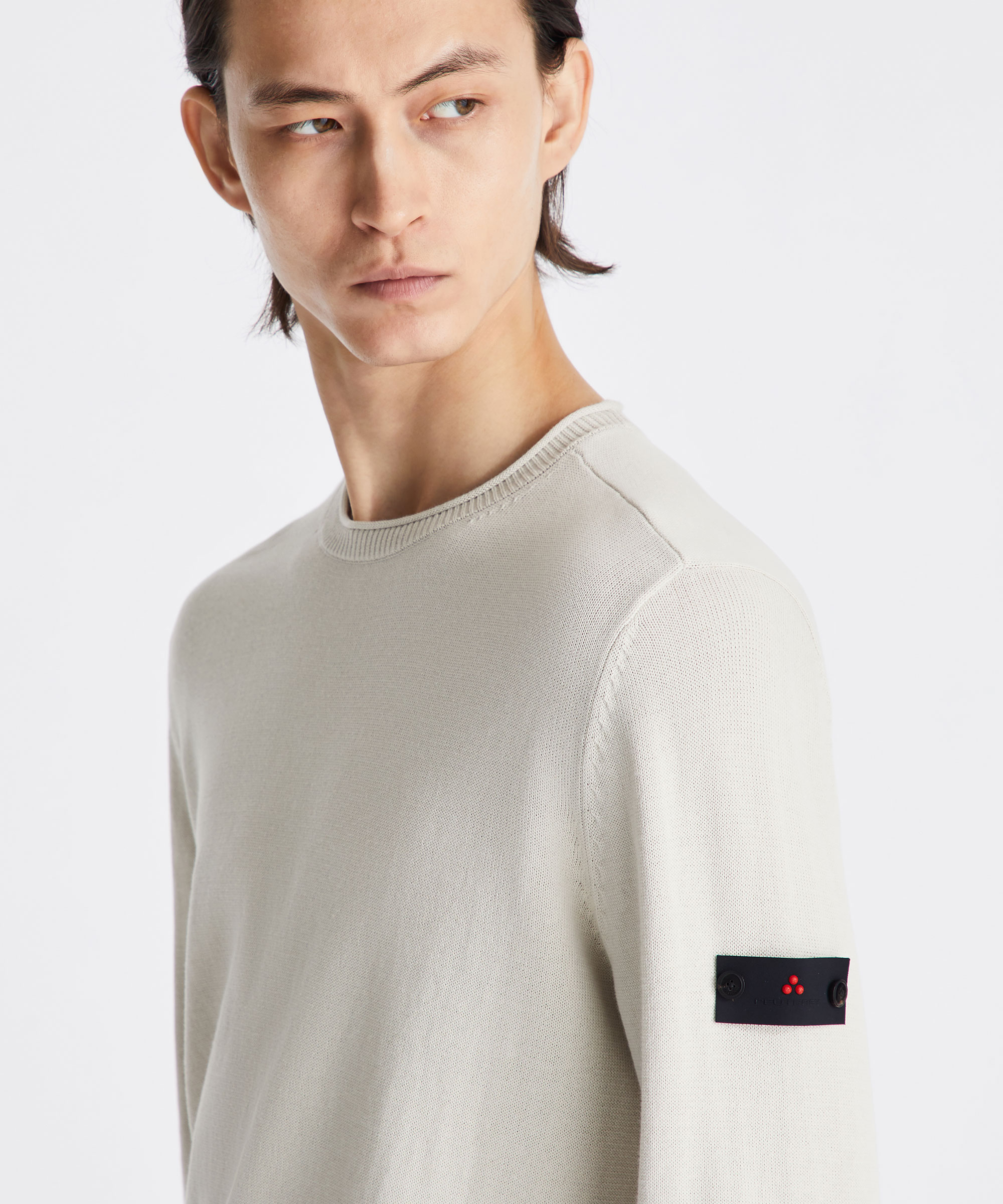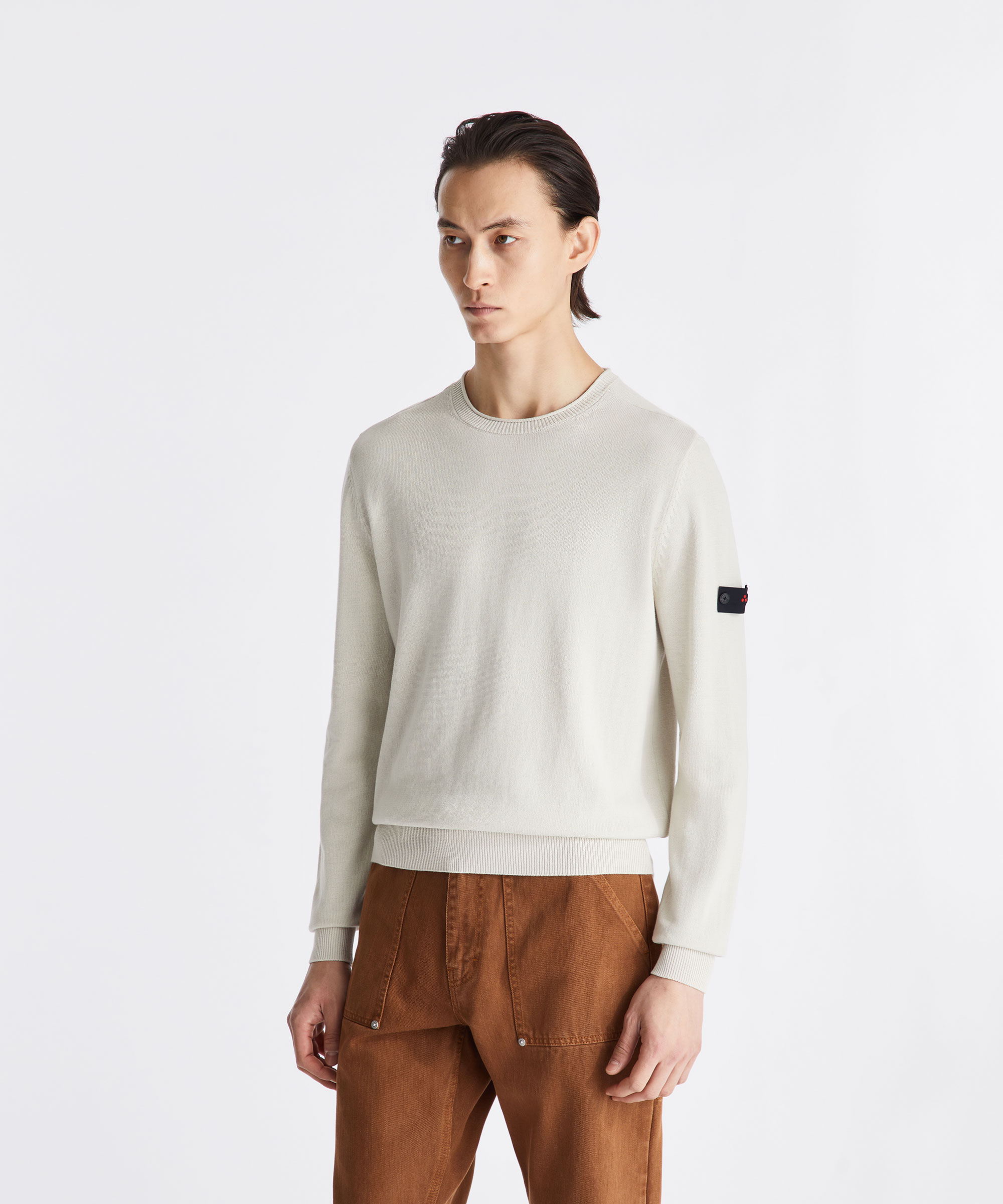 100% cotton knit crew-neck sweater. Soft texture and regular fit. Long sleeves and ribbed cuffs and hem. Minimalist lines to convey an essential and sophisticated attitude. Logo label on the left sleeve, fastened with two buttons. Lightweight and versatile, perfect for all kinds of occasions, from casual to sophisticated looks.