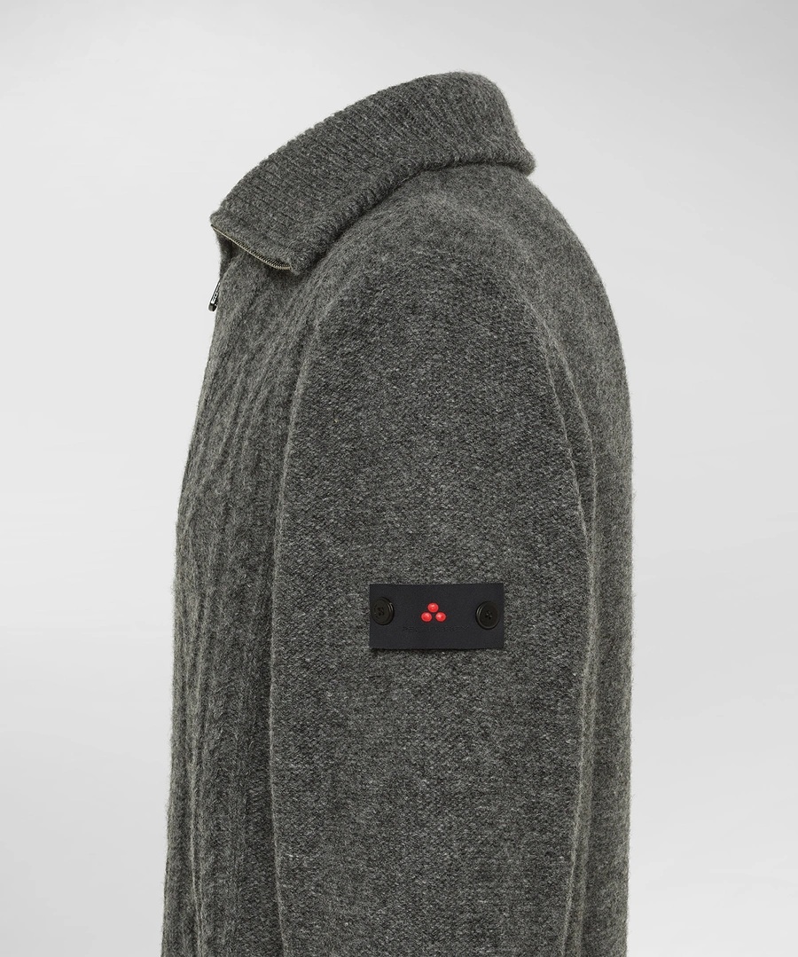 100% textured Shetland wool high-collar zipped sweater, embellished by a special Aran knit. Shetland wool, from the homonymous Scottish islands, is prized for its natural strength, enveloping warmth and lightness. In this version, it is processed with a slightly slubbed and textured effect that enhances the texture of the yarn, adding authentic and sophisticated allure. The cable knit pattern on the front recalls the charm of traditional knitwear, reinterpreted in a contemporary key. Ribbed bottom hem, collar and cuffs define the silhouette and ensure comfort. Peuterey’s trilogy logo – the brand’s iconic symbol – applied on the left sleeve marks this versatile sweater in an understated manner, perfect for an urban and refined style.