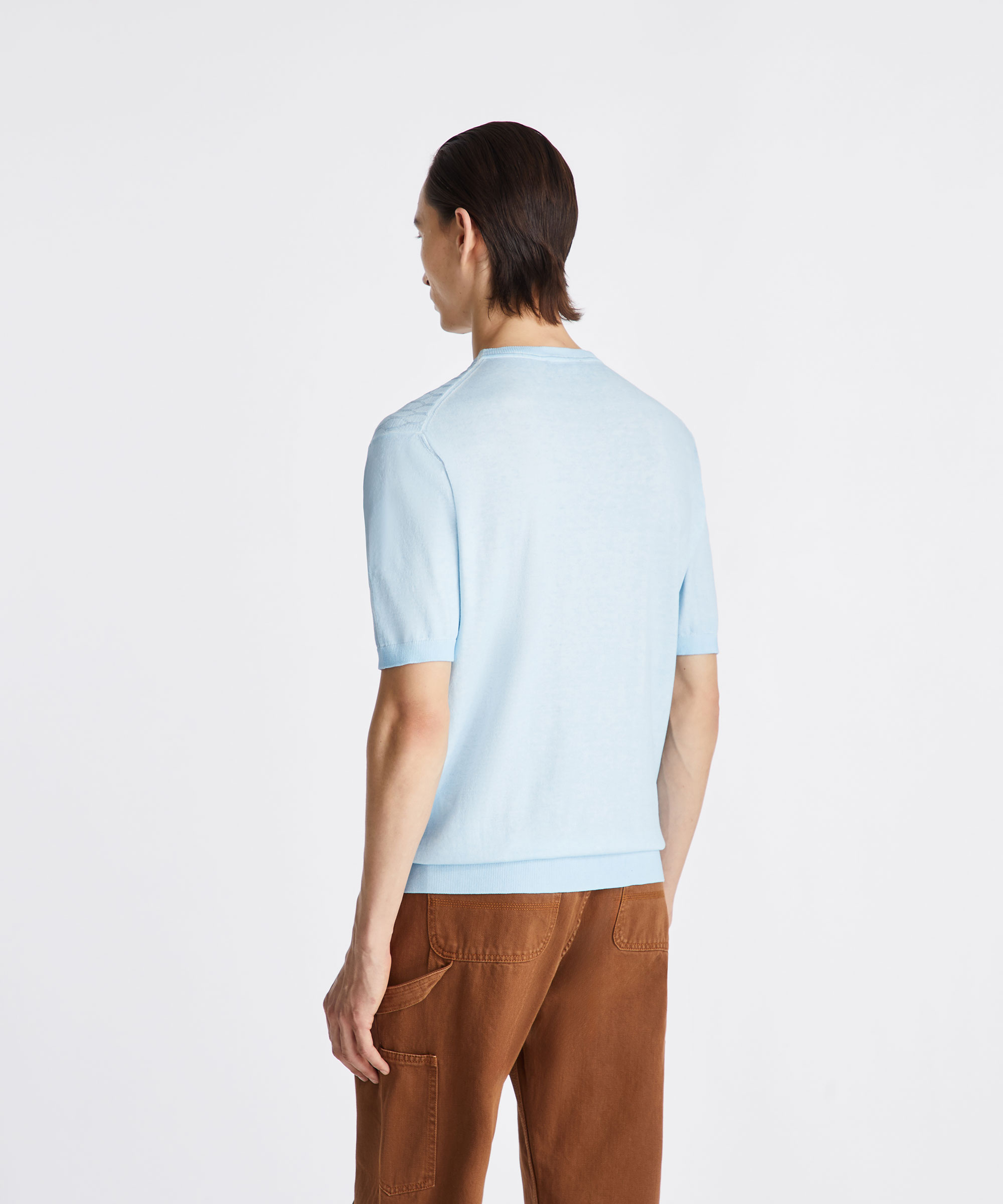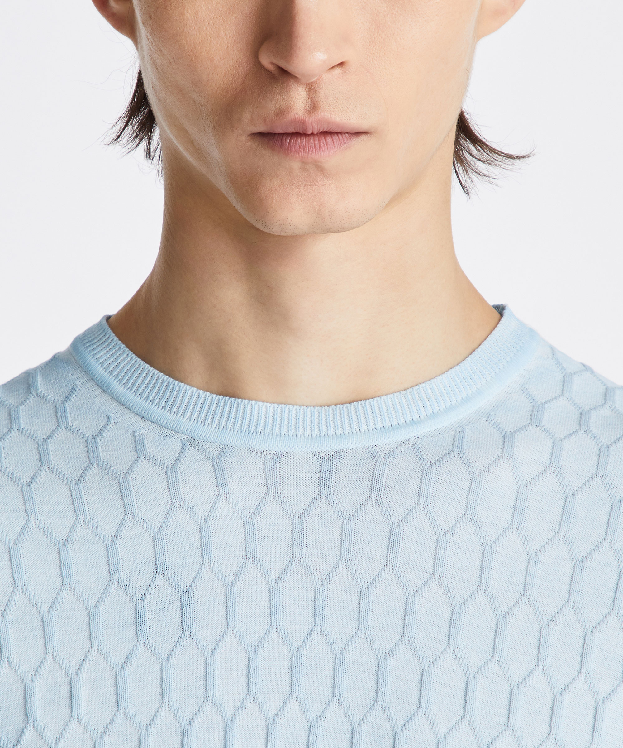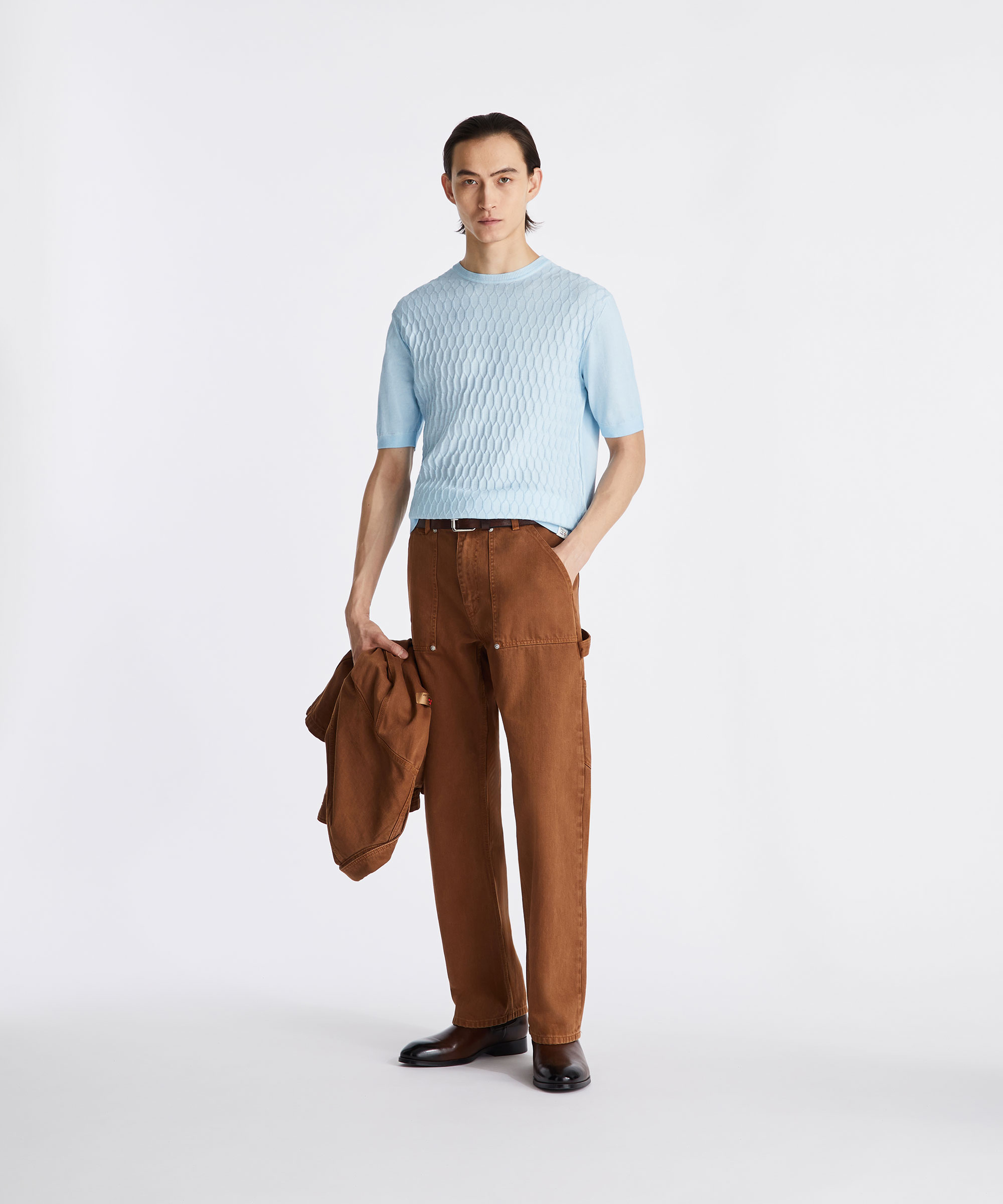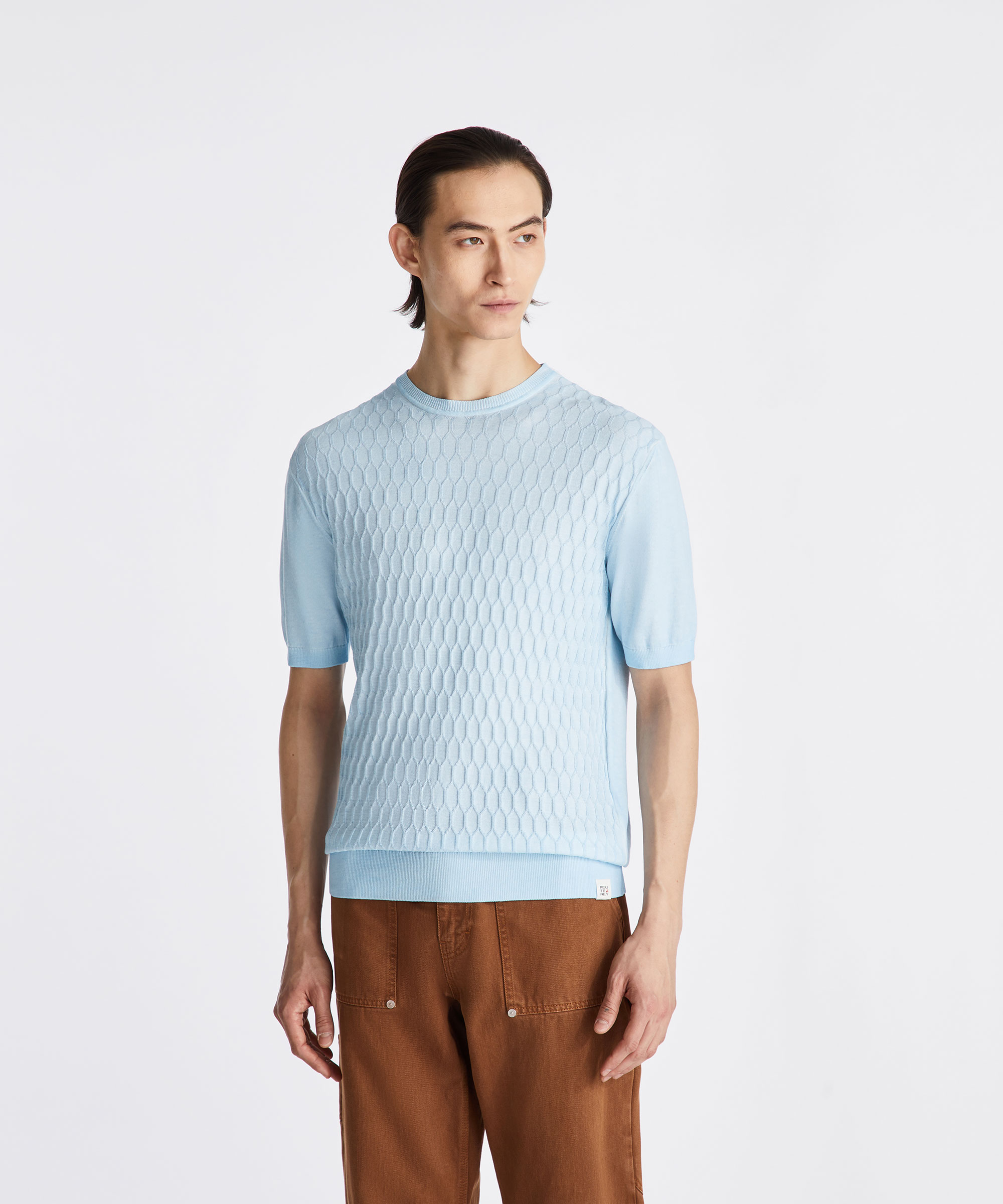 Short-sleeved garment-dyed textured cotton knit crew-neck T-shirt. Sophisticated geometric pattern and regular fit. A wardrobe staple reinterpreted with contemporary taste. The fabric’s refined texture adds character and elegance to the garment, while still retaining its simple, comforting shapes.