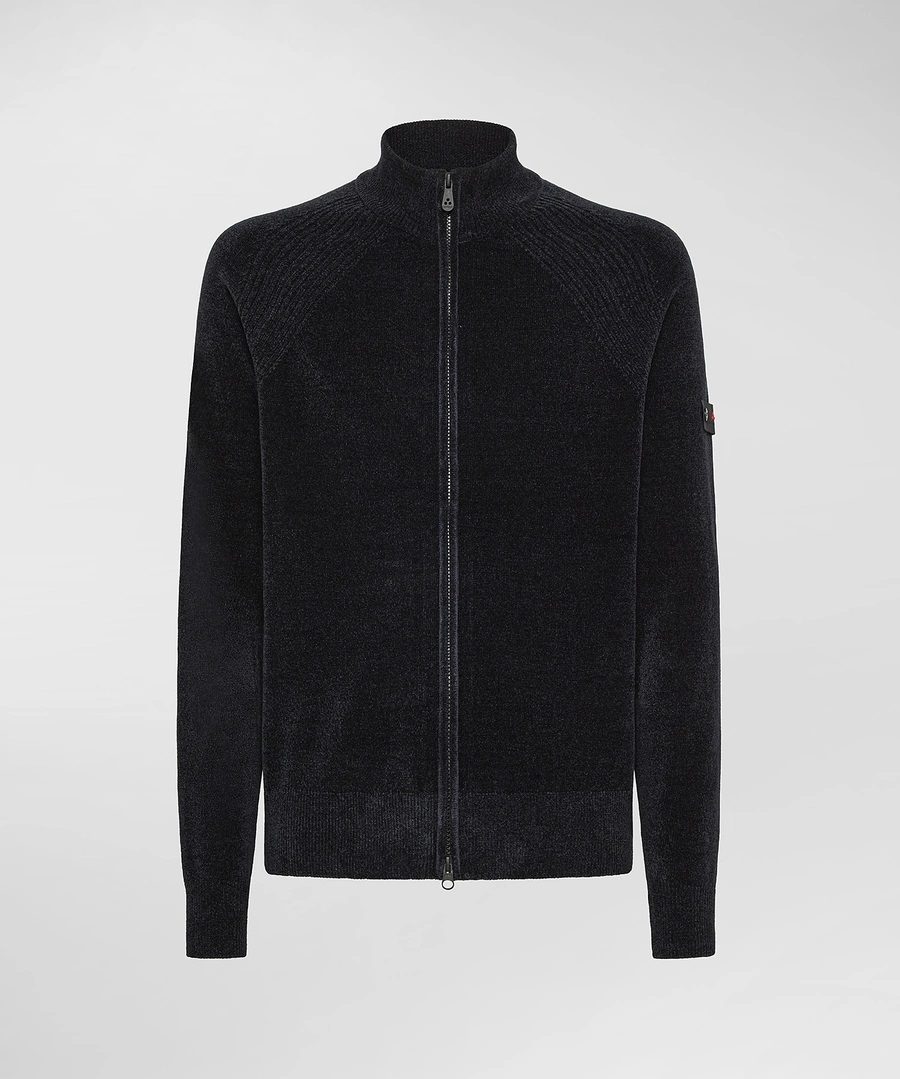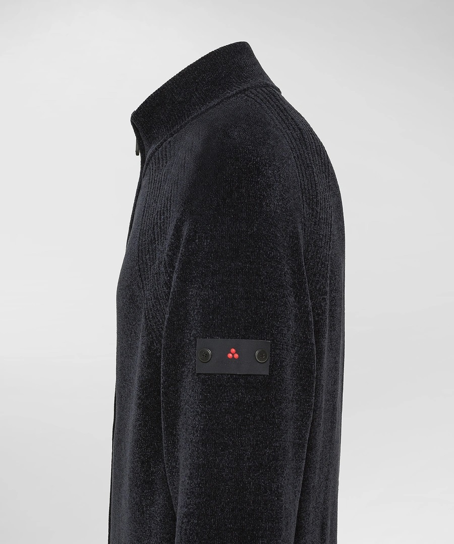 Shaved chenille sweater with a central double-slider zip, characterised by a soft hand and a sophisticated sheen. Ribbed details on the stand-up collar, cuffs and bottom hem enhance the garment’s structure, ensuring a comfortable and defined fit. Peuterey’s trilogy logo – the brand’s iconic symbol – is applied to the left arm with small buttons. Available in several solid-colour options. A basic garment to have in your wardrobe, made even more comfortable by the softness of the chenille.