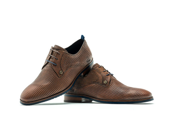 De combinatie van het stoere, met de hand afgewerkte tile-print en de bruine kleur geven deze rehab schoen een one of a kind look. De schoen heeft op de achterkant een mooi detail en is afgewerkt met een comfortabele rubberen zool. Het uitneembare voetbed zorgt voor een comfortabele pasvorm van deze nette herenschoen.
