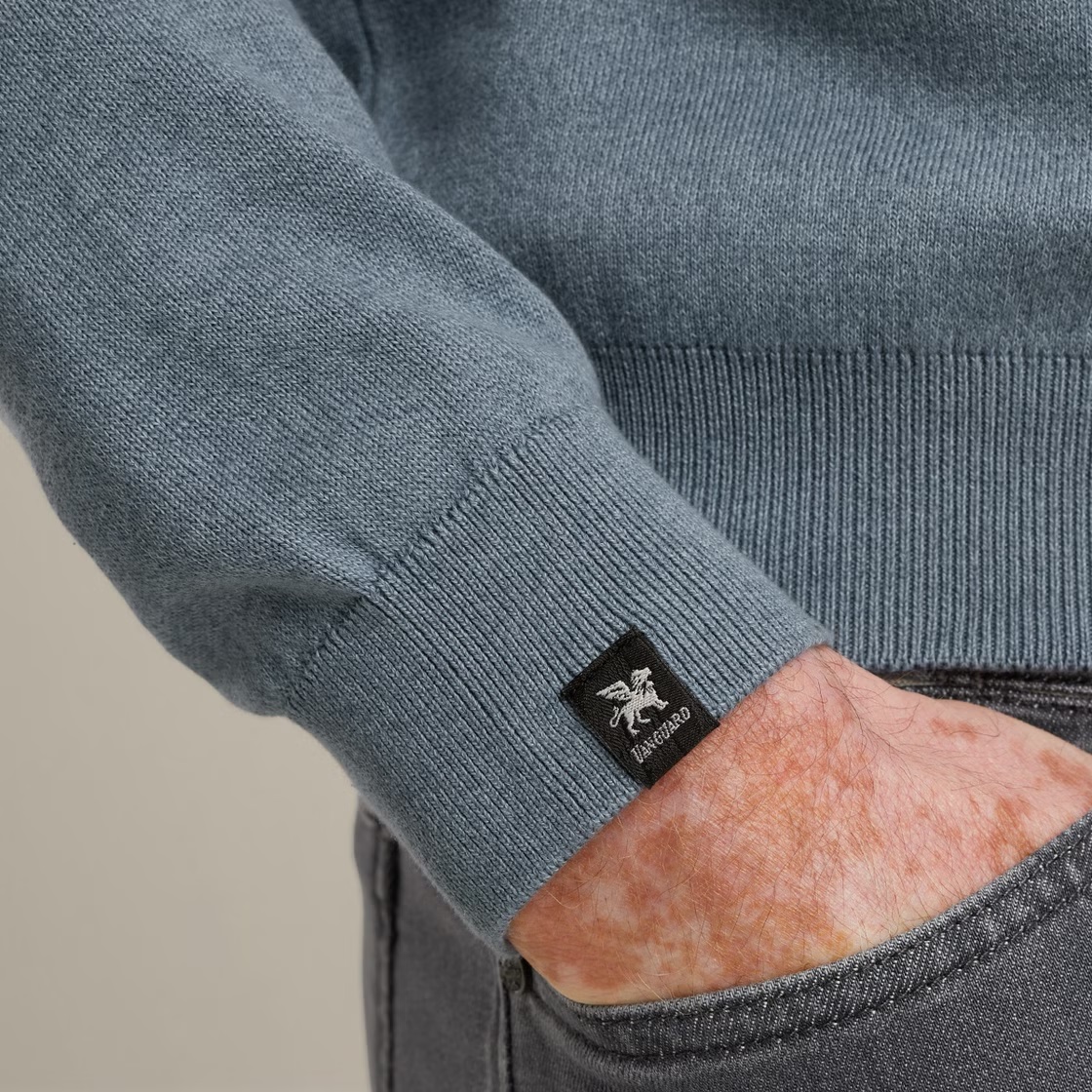 Op zoek naar een comfortabele, stijlvolle trui? Deze Vanguard trui met opstaande kraag en halve rits is dubbelgebreid voor een eigentijdse look. De trui, gemaakt van katoen mouliné, voelt zacht aan. De steekstructuur op de borst en de bovenkant van de mouw geeft de trui een stoere finish.